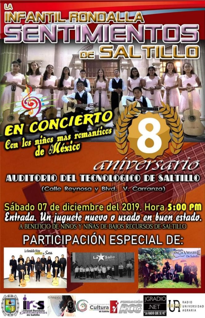Para celebrar su octavo aniversario, la Infantil Rondalla Sentimientos de Saltillo ofrecerá un imperdible concierto con el que deleitará al público asistente, quien además de pasar una tarde de romanticismo acompañada de las voces y guitarras de los integrantes de este ensamble, apoyarán a que niños de escasos recursos tengan una Feliz Navidad, ya que la entrada general a este espectáculo será de un juguete por persona.