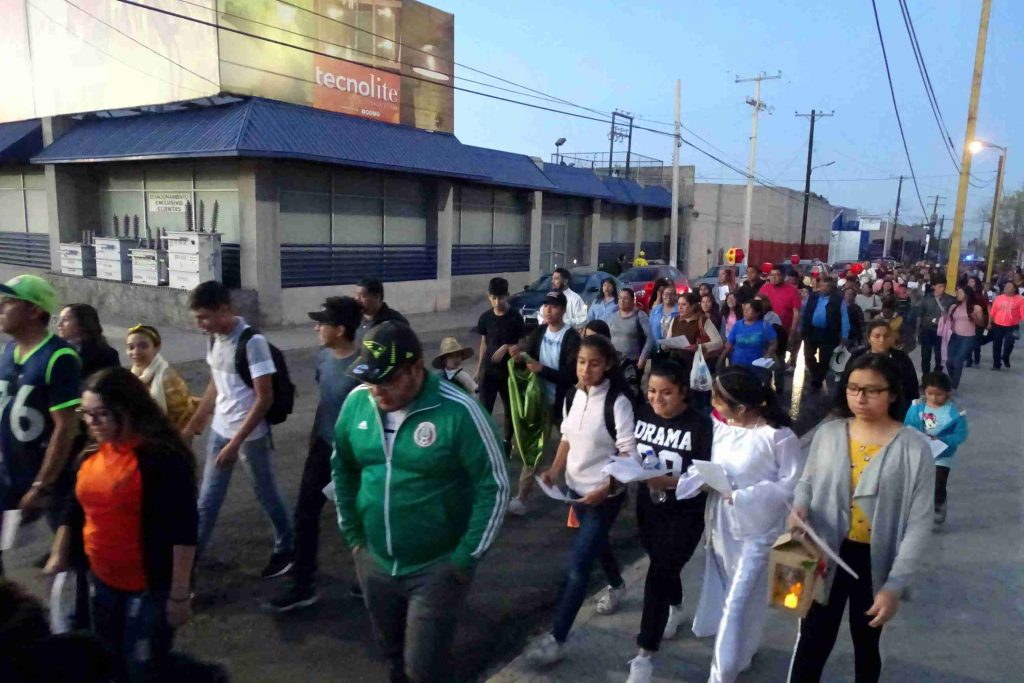 Avanzando desde la plaza de ciudades hermanas, comenzaron con diversos cantos y rezos por la calle Manuel Acuña, después Presidente Cárdenas para luego tomar General Cepeda hasta llegar a la iglesia. Al comenzar el arribo del contingente, se les espero a las afueras del templo con tamales, champurrado, bebidas de sabores, bolos y la tradicional piñata para los niños quienes participaron de igual forma en la caminata.