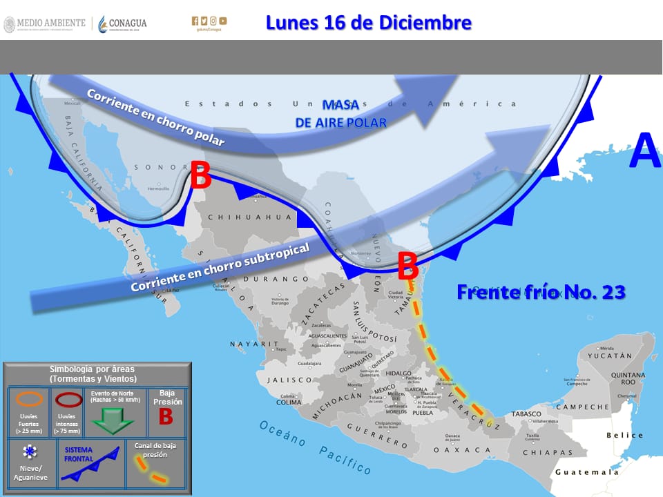 Francisco Martínez Ávalos, titular de PC Coahuila, detalló que el Frente Frío 23 se extiende sobre la región fronteriza del noroeste de México y es impulsado por una masa de aire marítimo polar, condiciones que ocasionarán rachas de viento que pueden superar los 80 km/h en zonas de Sonora y Chihuahua, así como rachas que pueden superar los 60 km/h en Baja California, Baja California Sur, Durango y Zacatecas, además de un marcado descenso de temperatura en el noroeste y norte de la República.