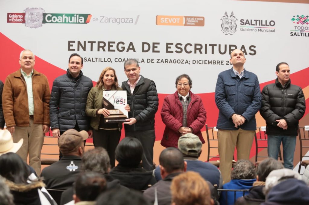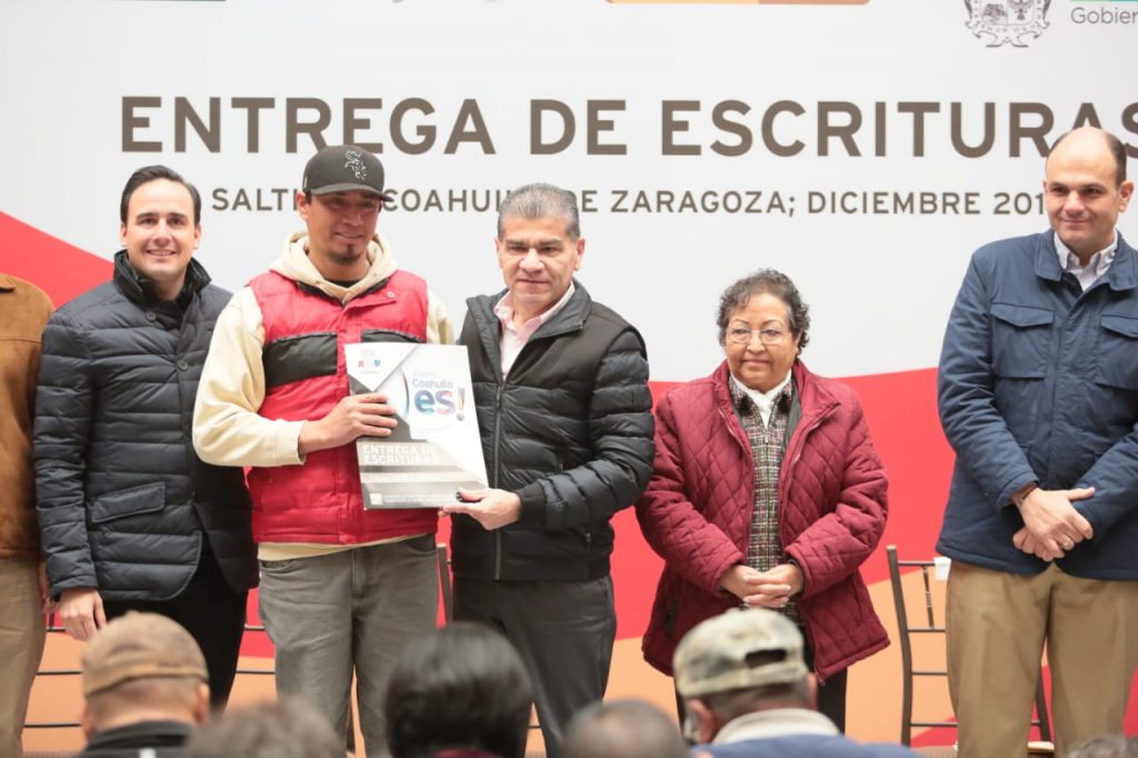 Al entregar 208 escrituras a igual número de familias de Saltillo, con las que sumaron 4 mil 521 en el año, cifra cuatro veces mayor a la de 2018, el gobernador Miguel Ángel Riquelme Solís destacó que los beneficiarios (as) recibieron “un trofeo de vida”, que se logró por el trabajo en equipo entre todas las instancias gubernamentales.