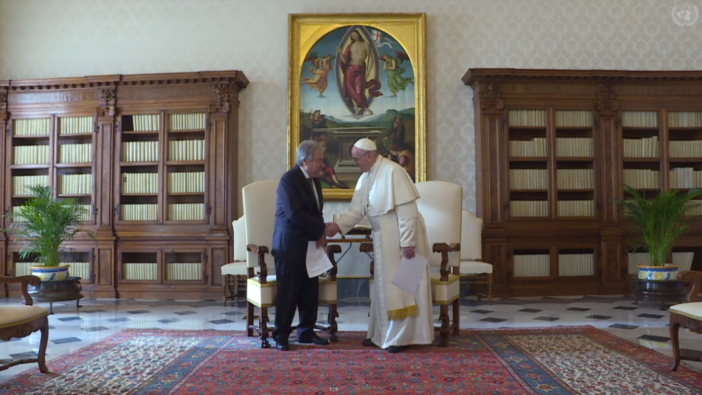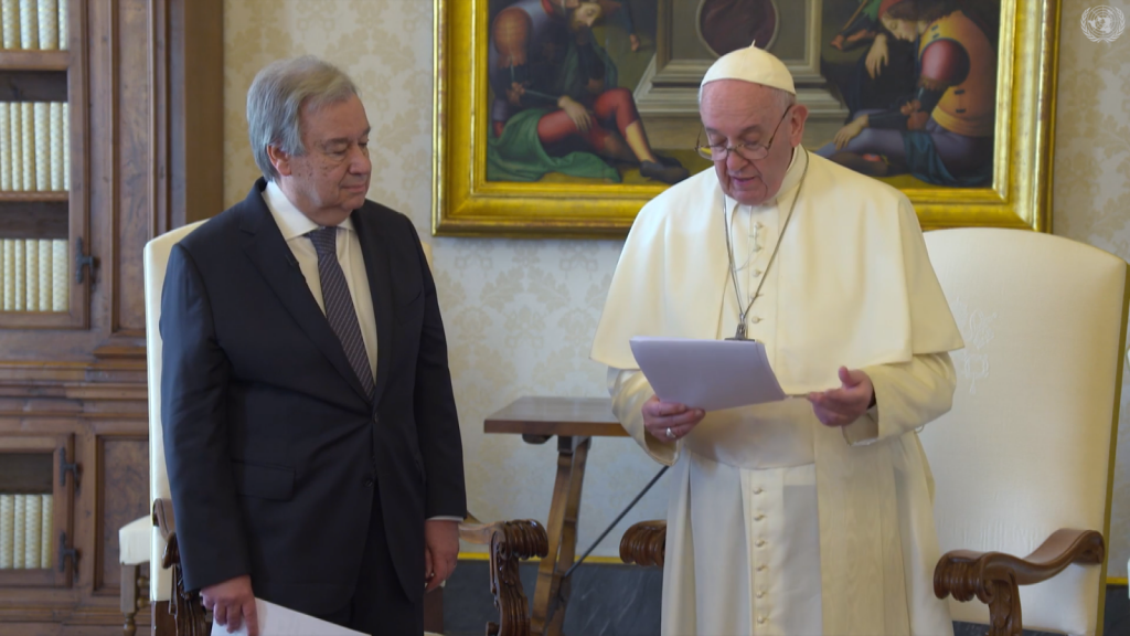 António Guterres elogió al jefe de la Iglesia Católica Romana por ser «un mensajero de la humanidad» que se ha pronunciado sobre temas como la crisis de refugiados, la pobreza, la desigualdad y la emergencia climática.