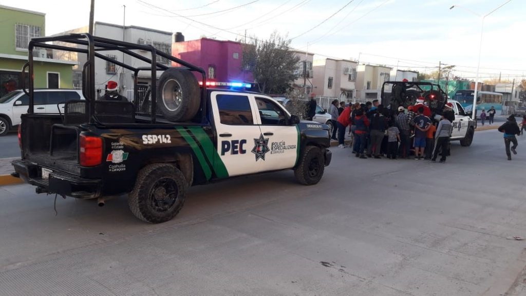 Por su parte, el Grupo Dragones de la Policía Especializada en Piedras Negras llevó a cabo un recorrido en las colonias Cedros, Noblasis y Acoros donde participaron con los menores y sus familias en las tradicionales posadas donde quebraron piñatas, entregaron bolos, pelotas y juguetes.