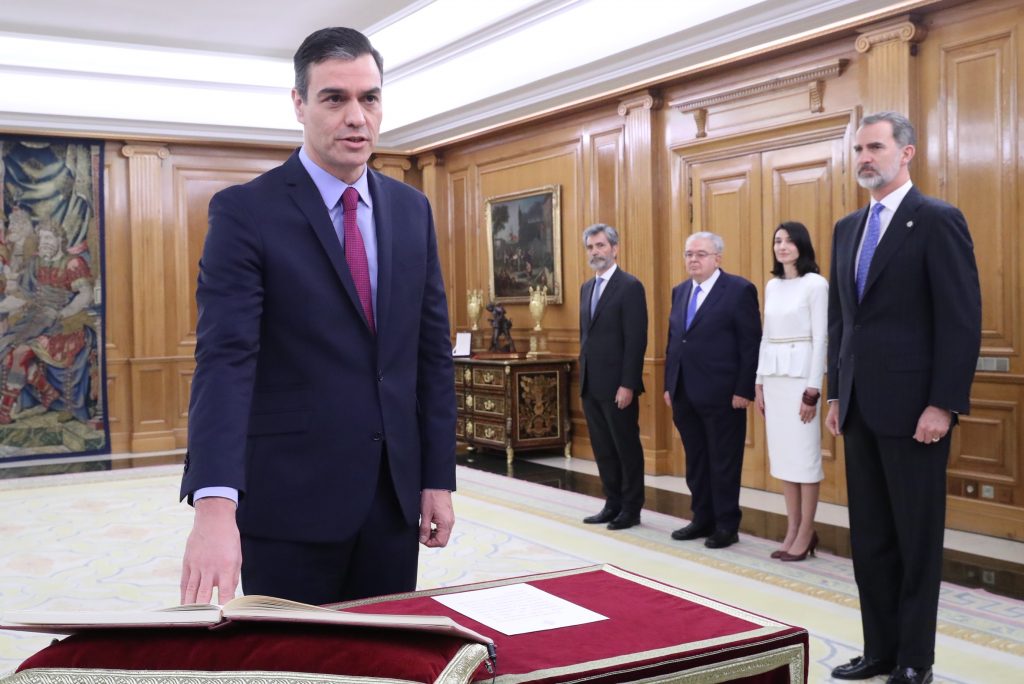 Sánchez manifestó ante la Constitución española la promesa por su conciencia y honor de cumplir con las obligaciones del cargo de presidente del Gobierno.