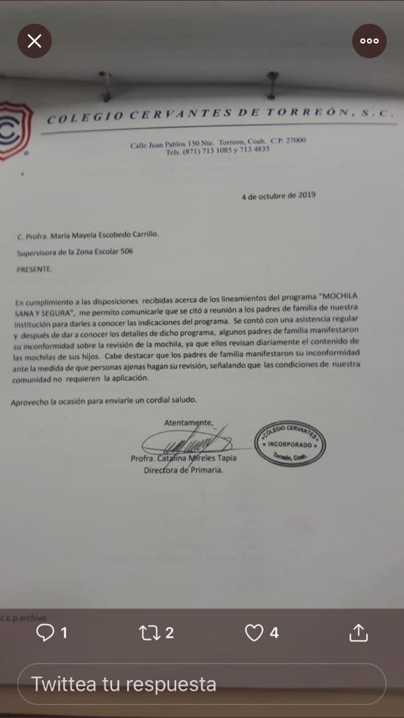Según consta en un oficio con fecha del 4 de octubre de 2019, firmado por la profesora Catalina Mireles Tapia, directora del Colegio Cervantes, tras citar a reunión a los padres de familia para darles a conocer las indicaciones del programa ‘Mochila Sana y Segura’, algunos “manifestaron su inconformidad sobre la revisión mochila”, pues aseguraron que “ellos revisan diariamente el contenido de las mochilas de sus hijos”.