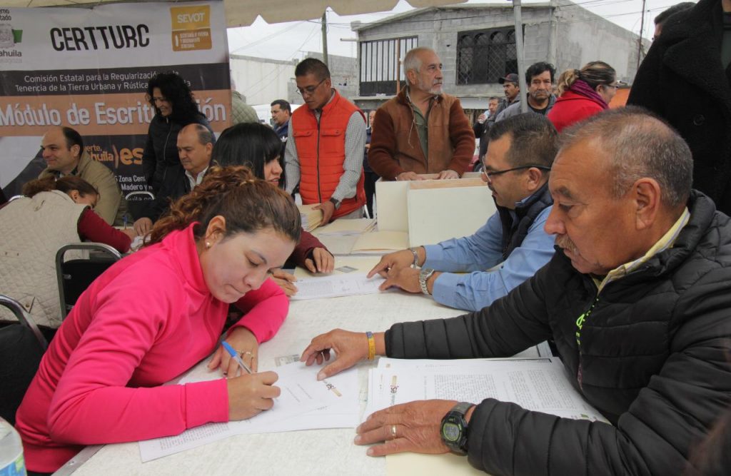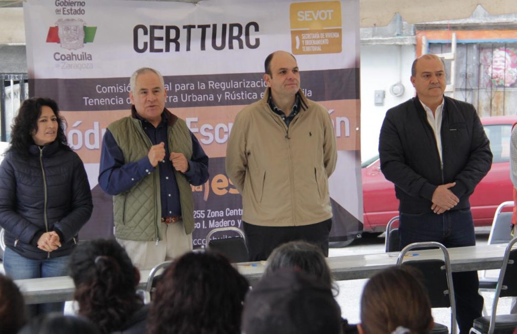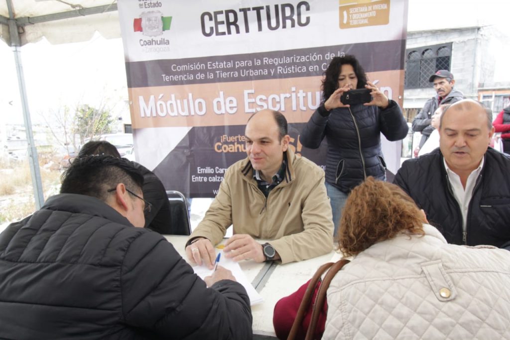 A nombre del Mandatario estatal, el Secretario de Vivienda y Ordenamiento Territorial, Jericó Abramo Masso, encabezó la firma de escrituras junto al Director General de la Comisión Estatal para la Regularización de la Tenencia de la Tierra Urbana y Rústica de Coahuila, Miguel Ángel Leal Reyes.