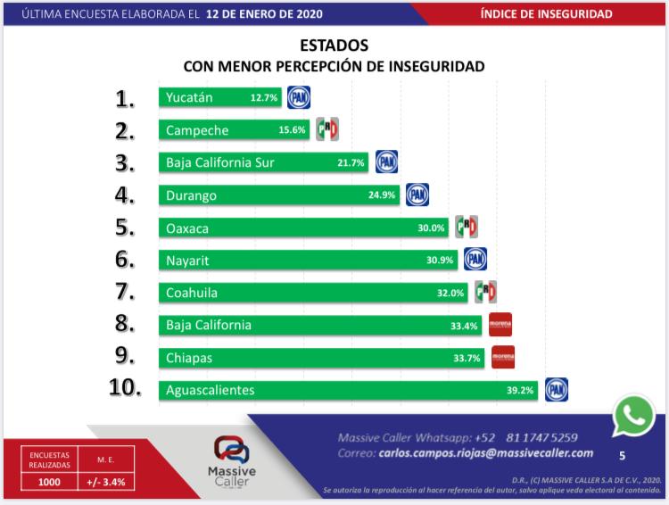 Coahuila es el sexto estado de la república en dónde sus habitantes se sienten más seguros. De acuerdo con una encuesta de Massive Caller elaborada ésta semana, nuestra entidad ocupa el sexto lugar nacional entre los estados con menor percepción de inseguridad. (EL HERALDO)