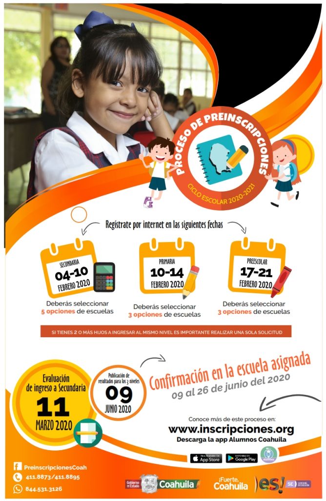 El secretario de Educación en Coahuila, Higinio González Calderón, destacó la importancia de difundir con antelación las fechas de preinscripción al nivel básico, para que los padres de familia analicen con tiempo aquellos planteles de su interés, ya sea por cercanía al hogar o al trabajo, y cumplir así con el trámite en los tiempos oficiales.