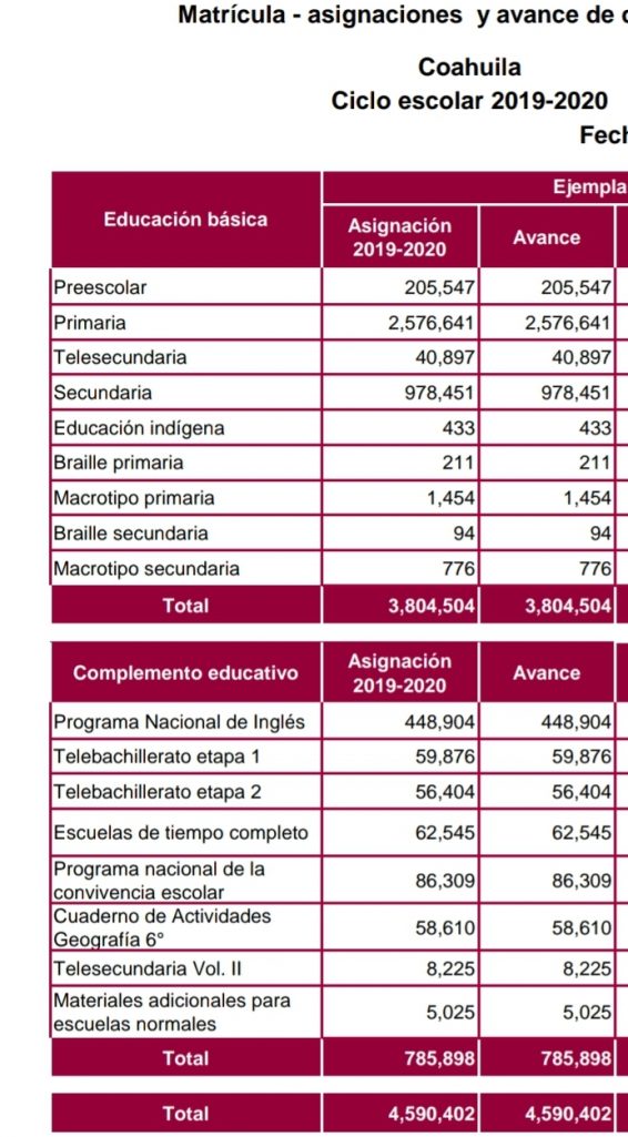 Para el ciclo escolar 2019-2020, Coahuila recibió 4 millones 590 mil 202 libros de texto gratuitos con lo que se cubrió la matrícula de educación básica; además se cuenta una reserva de 2 por ciento para casos en los que se puede generar faltante como la rotación de alumnos o construcción de nuevas escuelas.