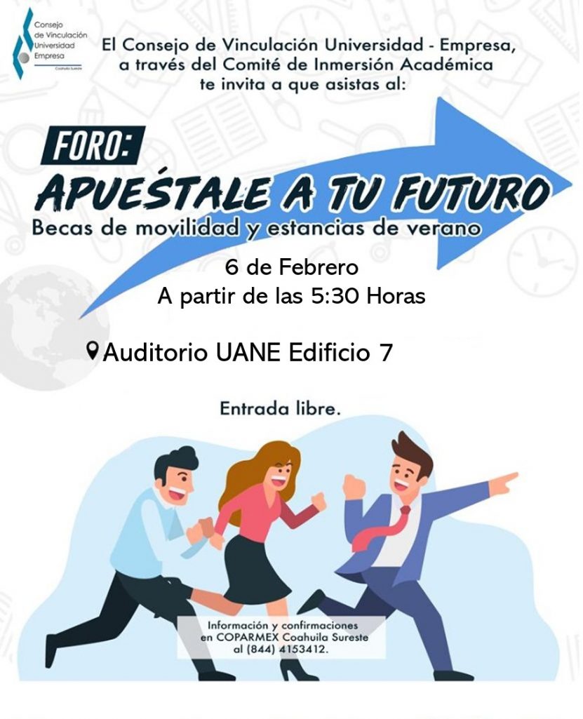 A realizarse el próximo 6 de febrero, a las 5:30 de la tarde, en el Auditorio de la Universidad Autónoma del Noreste (UANE. Edificio 7), el Foro «Apuéstale a tu Futuro», organizado por el Consejo de Vinculación Universidad-Empresa de la Confederación Patronal de la República Mexicana Coahuila Sureste (COPARMEX), permitirá a estudiantes de carreras profesionales, conocer las opciones de becas de movilidad y estancias de verano con las que cuentan algunos complejos educativos de la localidad.