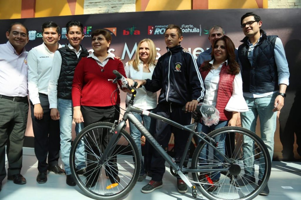 Marcela Gorgón, la alcaldesa Patricia Oralia Grado Falcón, Roberto Cárdenas Zavala, Director General del DIF Coahuila, y Sandra Gómez Salas, Directora General de Radio, Televisión y Fundación RCG, encabezaron esta tercera entrega que se realiza en el estado de mil bicicletas, que se distribuirán en todo Coahuila para facilitar el traslado de los estudiantes de su casa a la escuela, y su asistencia constante a los planteles educativos.