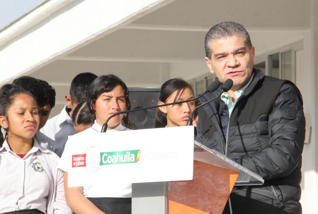 Ante Enrique Martínez y Martínez, ex Gobernador de Coahuila, y Arturo Berrueto, ex alcalde de Saltillo, invitados a la ceremonia, Miguel Riquelme exhortó al alumnado a aprovechar al máximo su educación secundaria.