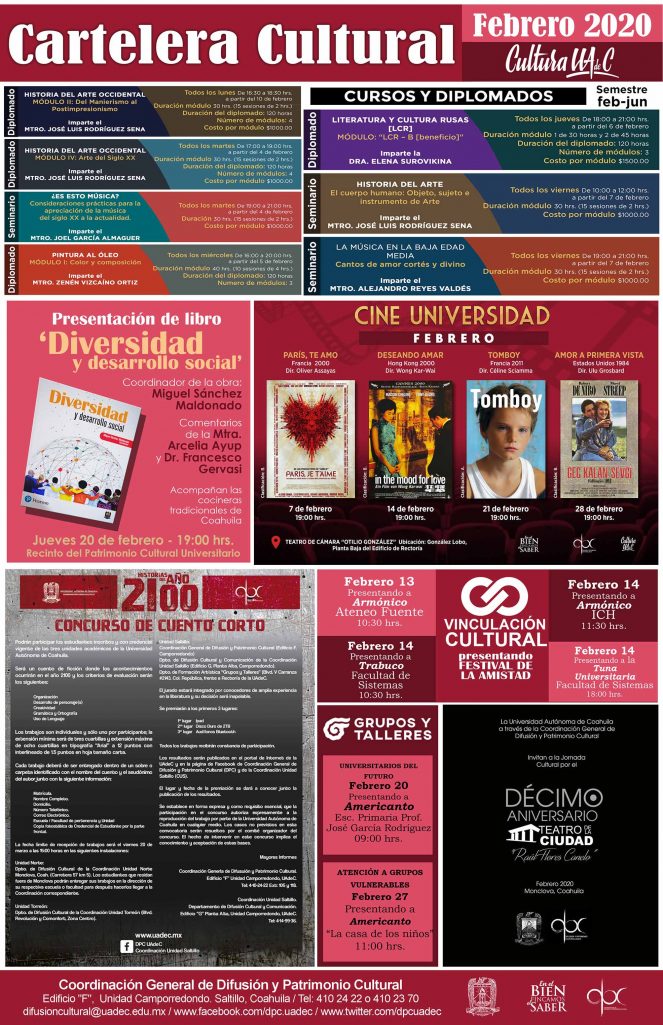 Diversas actividades culturales ofrecen la Universidad Autónoma de Coahuila a través de la Coordinación de Difusión y Patrimonio Cultural durante el mes de febrero, e invita a la comunidad universitaria y público en general a disfrutarlas en sus recintos, centros culturales, escuelas y facultades.