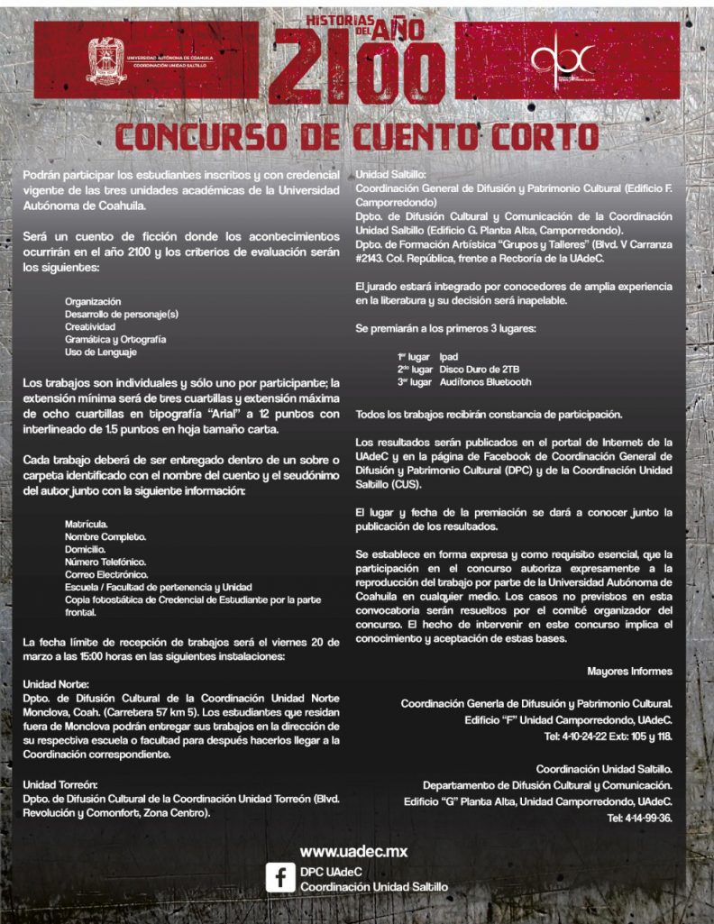 Los invitamos a seguir las redes sociales en donde encontraran la actualidad de la cultura universitaria: Facebook: dpc. uadec, Twitter: @dpcuadec, e Instagram: @dpcuadec. (EL HERALDO)