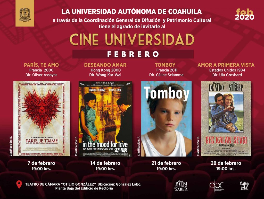 Se ofrecerá una selección de películas con el tema central del amor; para el 7 febrero se proyectará “Paris, te amo” del director Oliver Assayas; el 14 de febrero “Deseando amar” dirección Wong Kar-Wai, el 21 de febrero “Tomboy” del director Céline Sciamma y el 28 de febrero “Amor a primera vista” del director Ulu Grosband.