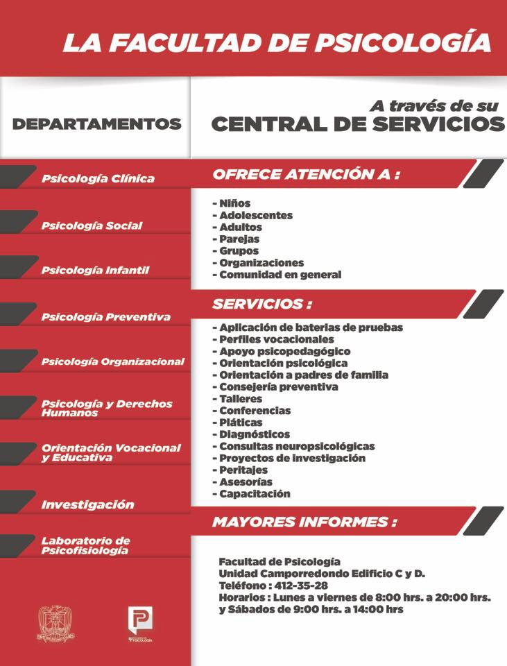 La Central de Servicios Psicológicos fue creada en 1976 como oportunidad de desarrollo profesional para los estudiantes de la Facultad y actualmente está conformada por ocho departamentos: Psicología Clínica, Psicología Infantil, Psicología Preventiva y Consejería Familiar, Orientación Vocacional y Educativa, Psicología Organizacional, Psicología Social, Laboratorio de Psicofisiología, Investigación, Psicología Jurídica y Derechos Humanos.
