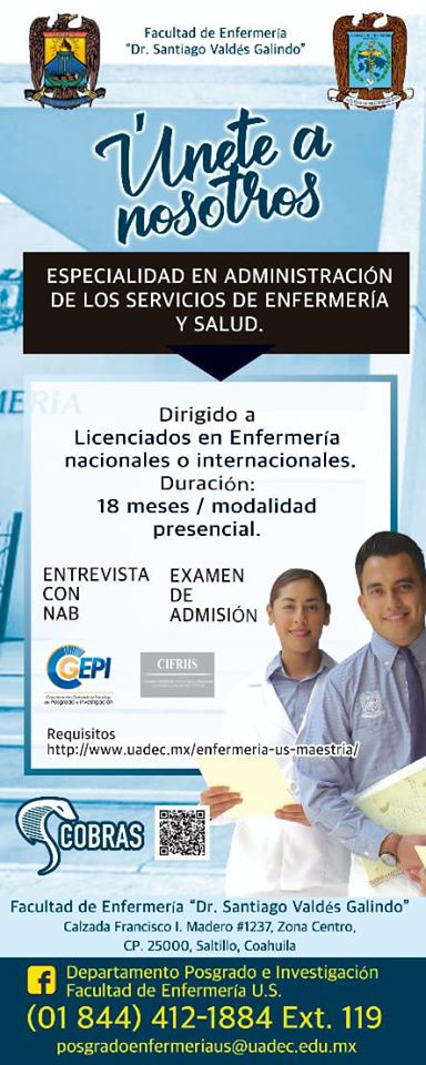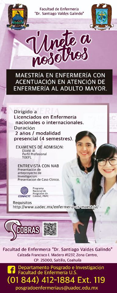 La Facultad de Enfermería “Dr. Santiago Valdés Galindo” de la Universidad Autónoma de Coahuila, convoca a inscribirse en la Maestría en Enfermería con Acentuación en Atención de Enfermería al Adulto Mayor y en la Especialidad en Administración de los Servicios de Enfermería y Salud, que iniciarán clases en agosto de 2020.