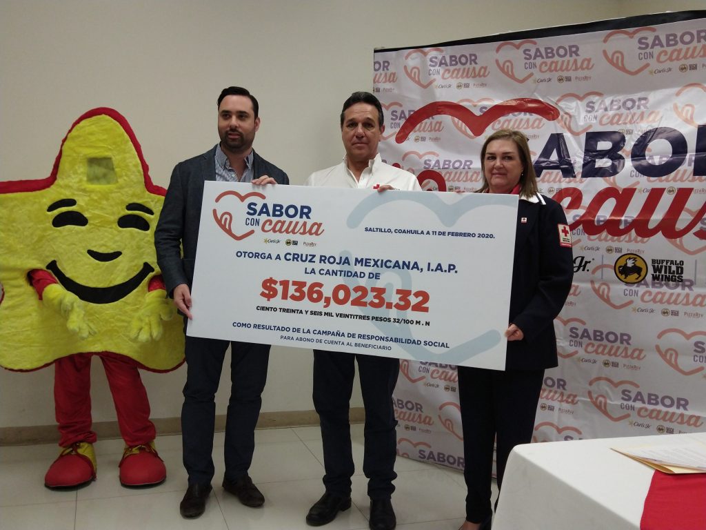 Asimismo, se hizo entrega también de un donativo a la Cruz Roja por 136 mil 23 pesos que se obtuvieron mediante la actividad del redondeo en las sucursales de los restaurantes de hamburguesas Carl’s Jr. (ÁNGEL AGUILAR)