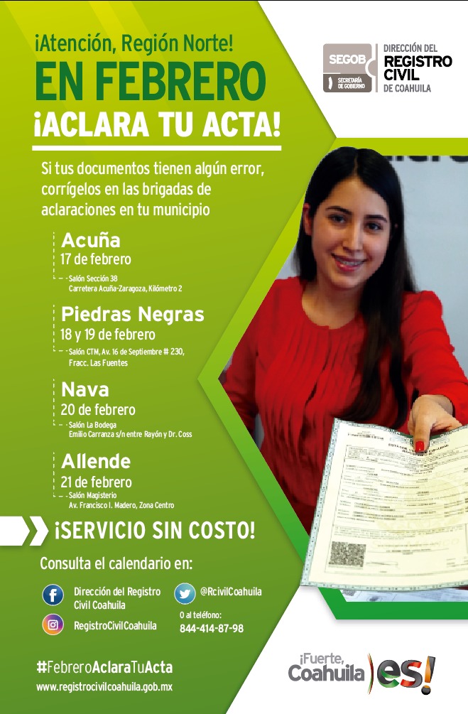 Acuña, Coahuila.- Con el objetivo de ofrecer a los coahuilenses la oportunidad de realizar aclaraciones de actas sin necesidad de trasladarse a la Capital de Coahuila, el Gobierno del Estado, a través de la Dirección del Registro Civil, realiza en marzo el Mes de Aclaraciones, en el que más de mil 500 trámites han sido realizados en la Brigada del Registro Civil que se ha llevado a cabo en las regiones Sureste, Centro y Carbonífera del estado.