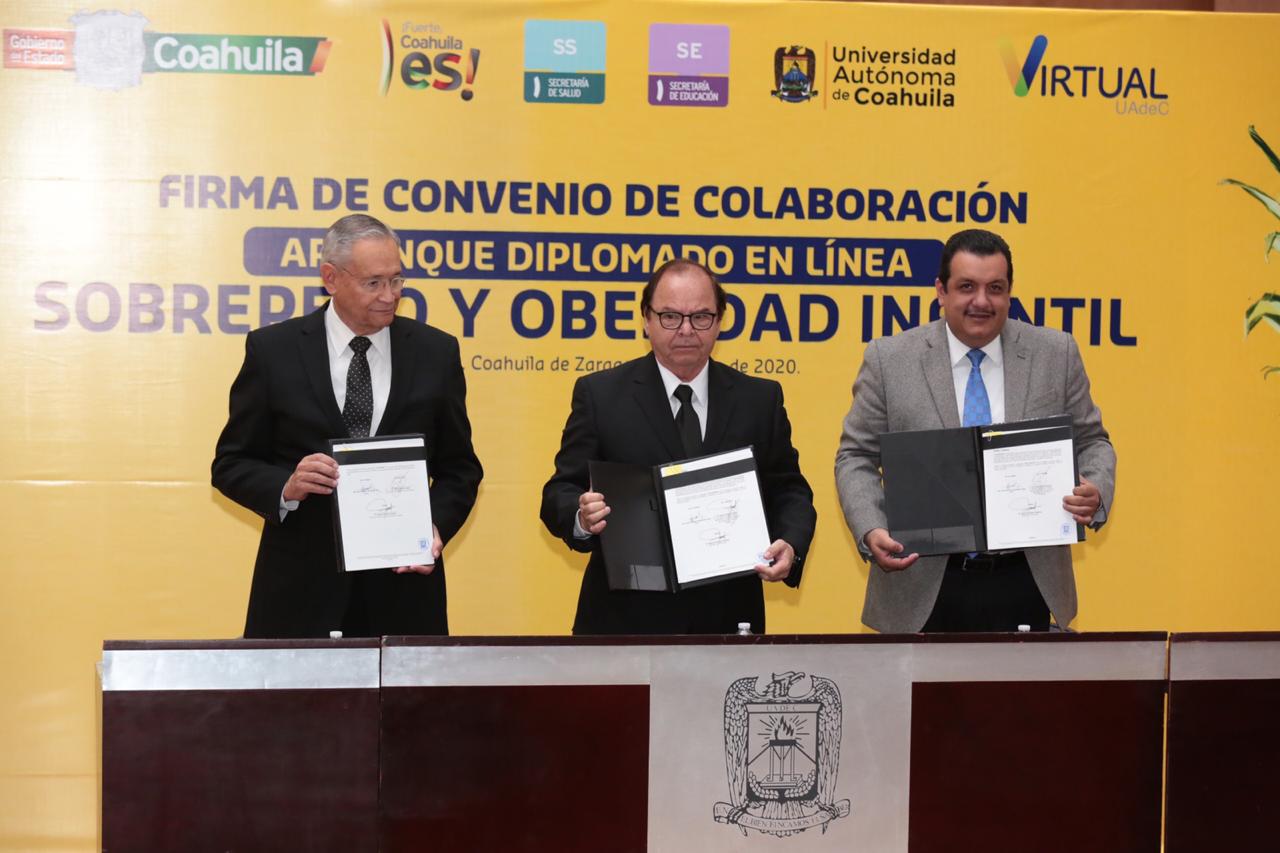 A su vez, se dio la firma de convenio de colaboración en materia de enseñanza e investigación entre la Secretaría de Salud (SS), la Secretaría de Educación (SE) y la Universidad Autónoma de Coahuila (UAdeC), con la finalidad de llevar a cabo los apoyos, asesoría y diseño institucional para los productos, contenidos virtuales, la creación de cursos en línea y los instrumentos jurídicos específicos correspondientes.