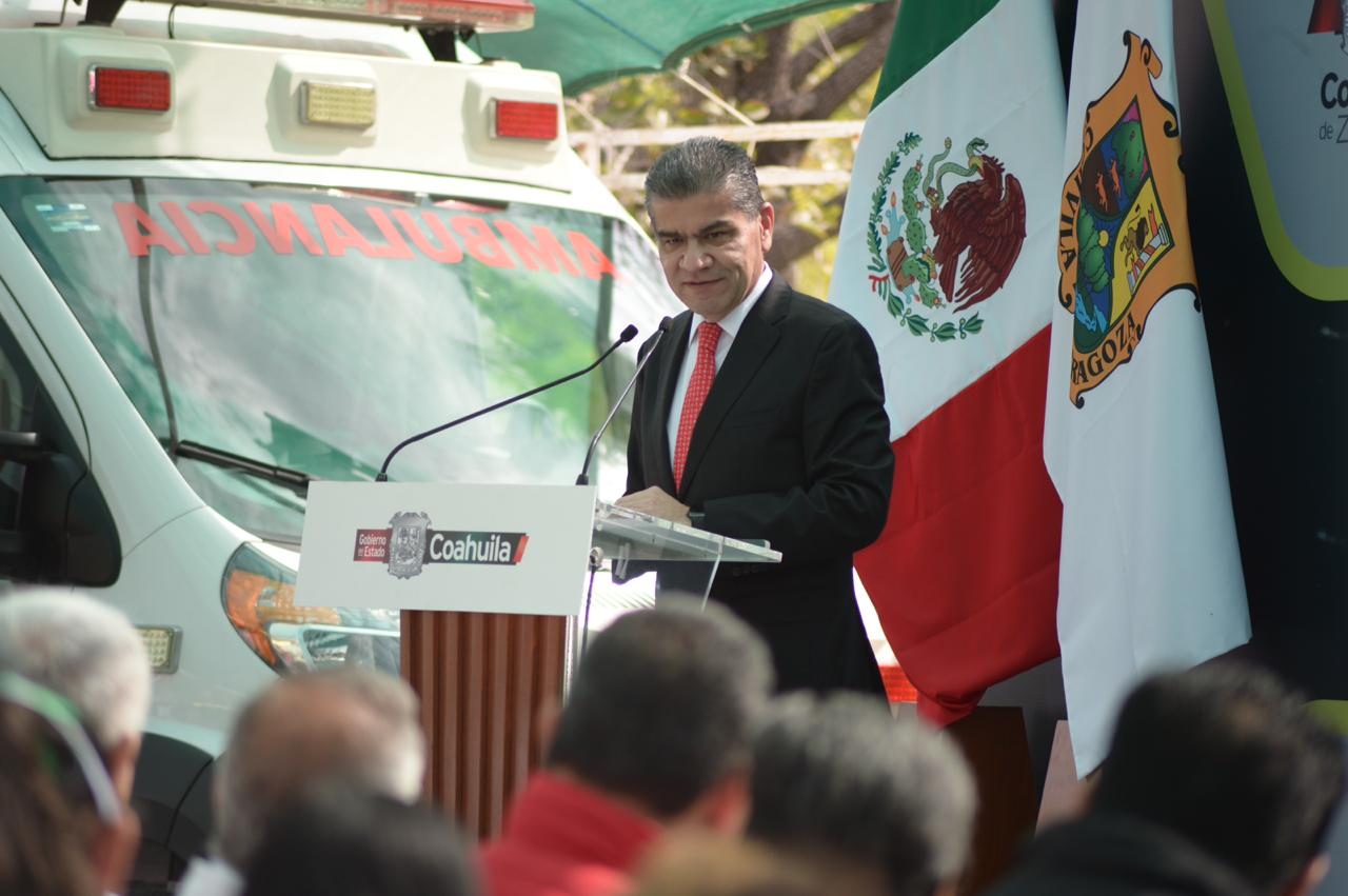 Frontera, Coahuila.- Con la entrega de una ambulancia totalmente equipada y el arranque de obras de 3 cuadras de pavimentación en la Zona Centro, inversiones por 20 millones de pesos, el Gobierno del Estado proyecta mejor infraestructura de beneficio colectivo y a la vez cumple con compromisos de mejorar el equipamiento de las corporaciones que velan por la seguridad e integridad de las familias coahuilenses, señaló el gobernador Miguel Ángel Riquelme Solís.