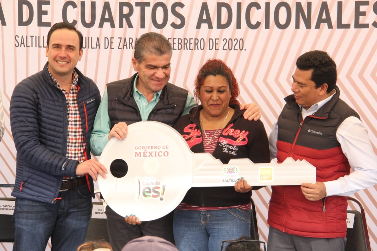 Junto al alcalde Manolo Jiménez Salinas; al delegado del Gobierno de la República en Coahuila, Reyes Flores Hurtado; los secretarios de Vivienda y Ordenamiento Territorial, Jericó Abramo Masso, y de Inclusión y Desarrollo Social, Francisco Saracho Navarro, inauguró el cuarto adicional que se levantó en la vivienda de la señora Yolanda Medina Rosales.