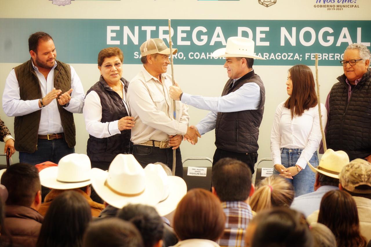 El Gobierno de Coahuila, a través de la Secretaría de Desarrollo Rural, entregó material vegetativo del programa “Establecimiento de Nogal” a productores de este municipio, por una cantidad de 17 mil 500 nogales, de un total de 25 mil para esta región y 35 mil para todo el estado, evento encabezado por el gobernador Miguel Ángel Riquelme Solís.