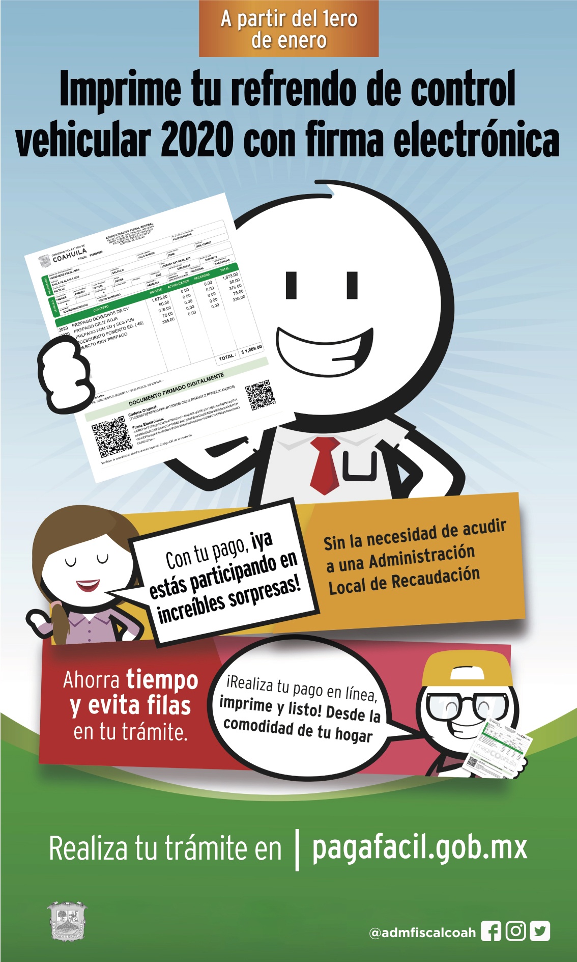 El funcionario hizo una invitación para que en marzo, para el trámite de Refrendo 2020, se haga uso de esta opción y realicen su pago en línea a través del portal web www.pagafacil.gob.mx, la aplicación para celular Pagafácil Coahuila o en la cuenta de AFG de facebook messenger, y de esta manera imprimir el refrendo y listo, tendrán su documento digital con validez oficial a la mano, sin hacer filas y sin necesidad de acudir a las oficinas de Recaudación del Estado.
