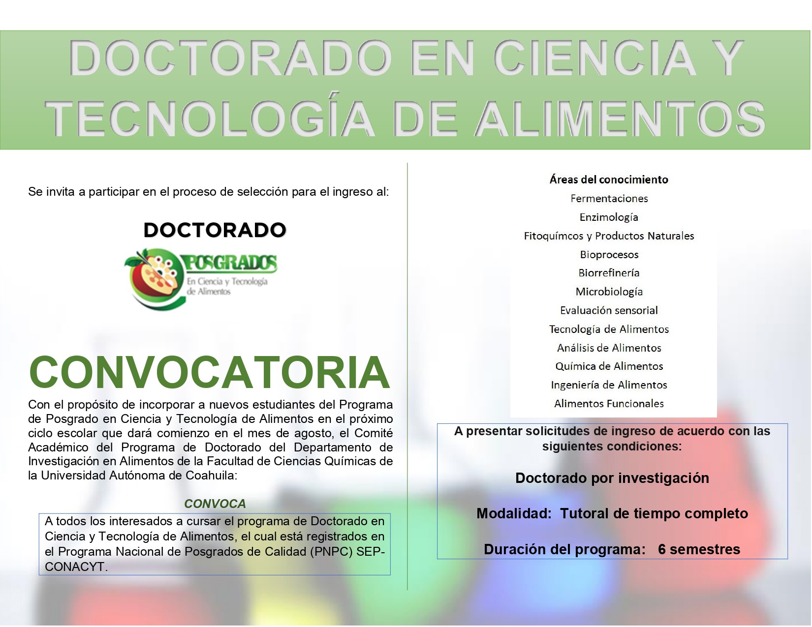 La Facultad de Ciencias Químicas de la Universidad Autónoma de Coahuila convoca a cursar el Doctorado en Ciencia y Tecnología de Alimentos, para el semestre agosto-diciembre de 2020.