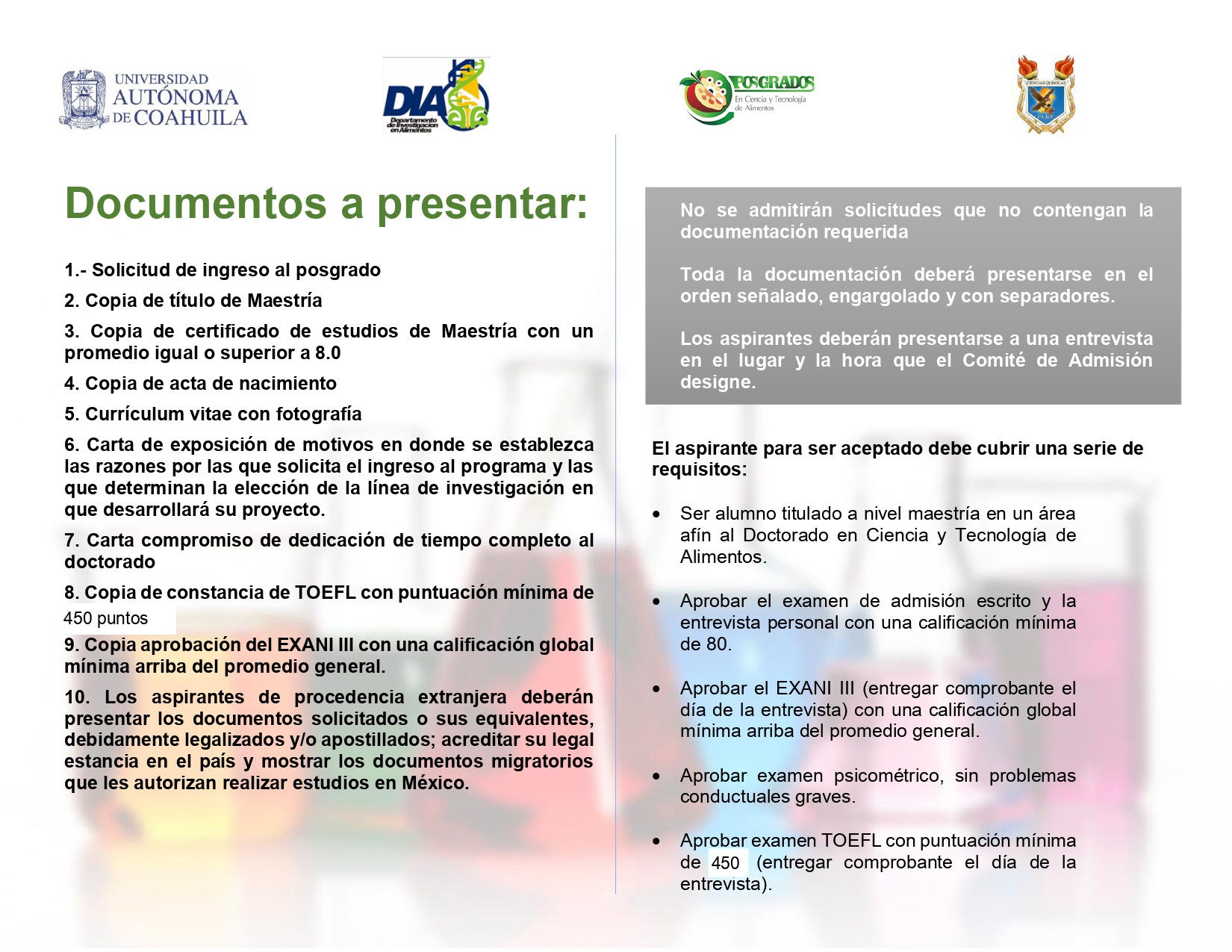 Los interesados presentar solicitud de ingreso al posgrado, copia de título de Maestría, copia de certificado de estudios de Maestría con un promedio igual o superior a 8.04, copia de acta de nacimiento, currículum vitae con fotografía.