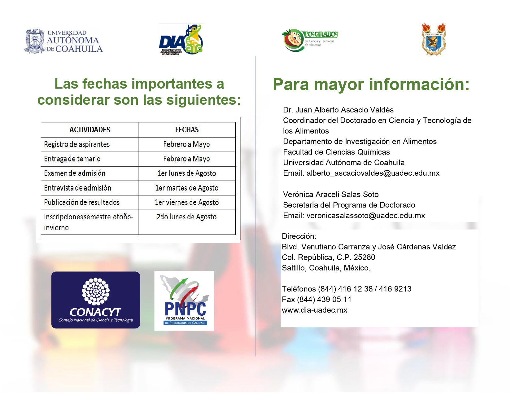 Para más información dirigirse con el coordinador del Doctorado en Ciencia y Tecnología de Alimentos, el Dr. José Luis Martínez Hernández al correo alberto_ascaciovaldes@uadec.edu.mx, o con Verónica Araceli Salas Soto veronicasalasassoto@uadec.edu.mx o comunicarse a los teléfonos (844) 416 12 38 y 416 92 13. (EL HERALDO)