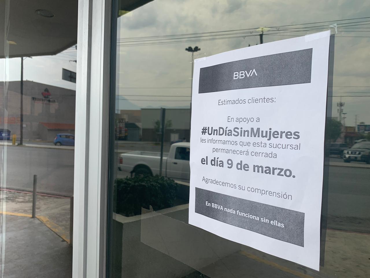Algunos bancos tampoco tuvieron actividad este lunes, bajo la misma premisa que en las escuelas, pues la mayor parte de su equipo es femenino y sus actividades se verían afectadas, tal fue el caso de Bancomer, que desde días antes informó que no tendría servicio. Las instituciones bancarias que decidieron abrir este lunes pidieron paciencia a sus clientes, pues ante la falta de personal femenino la atención sería limitada.