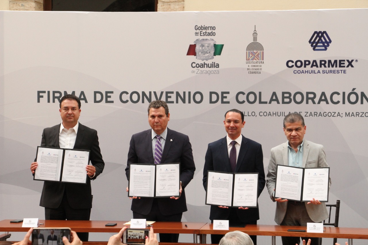 Con la presencia del Gobernador del Estado, Miguel Ángel Riquelme Solís como testigo de honor, el Congreso del Estado de Coahuila y Coparmex Coahuila Sureste firmaron un convenio de colaboración interinstitucional para impulsar una agenda legislativa en común y encaminada a mejorar la competitividad del estado.
