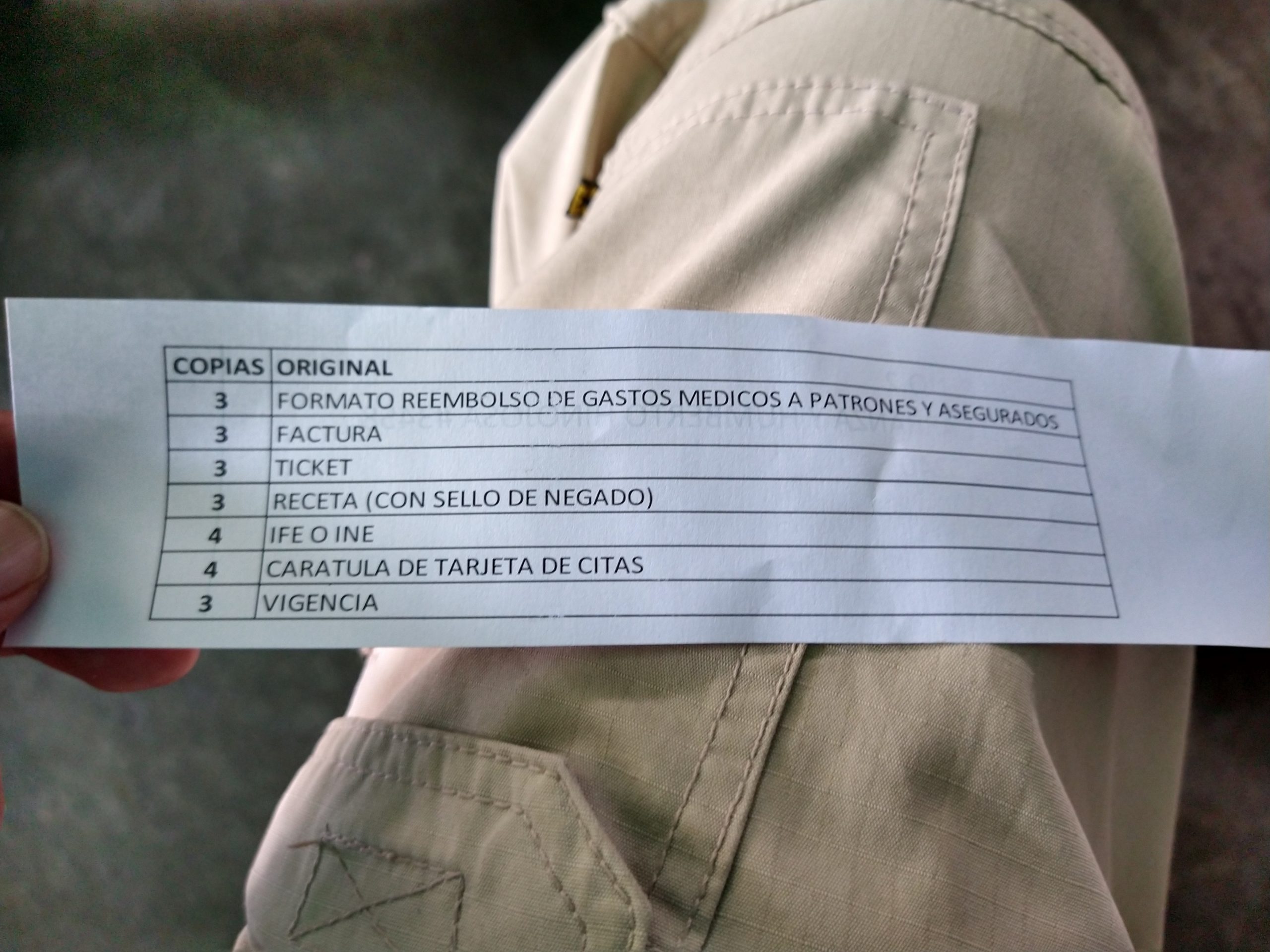 Por si lo anterior no fuera poco, también se pide presentar tres copias del formato de reembolso, además del original, tres copias de la factura del medicamento adquirido, tres copias del ticket entregado por el establecimiento, tres copias de la receta con sello de negado, cuatro copias de la credencial del INE, y cuatro copias de la carátula de la tarjeta de citas.