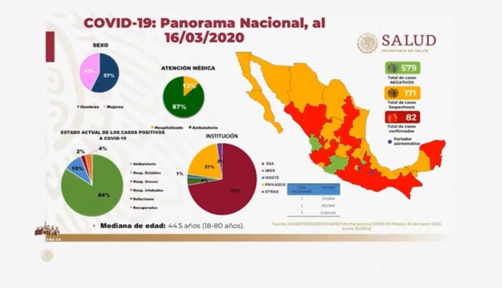 Ciudad de México.- Autoridades de la Secretaría de Salud federal (Ssa) informaron en conferencia de prensa que el número de casos confirmados de la nueva cepa de coronavirus (Covid-19) aumentó a 82 en México, 29 más de los que se tenían contabilizados hasta este domingo, de los cuales 43% son mujeres y el 57% son hombres.