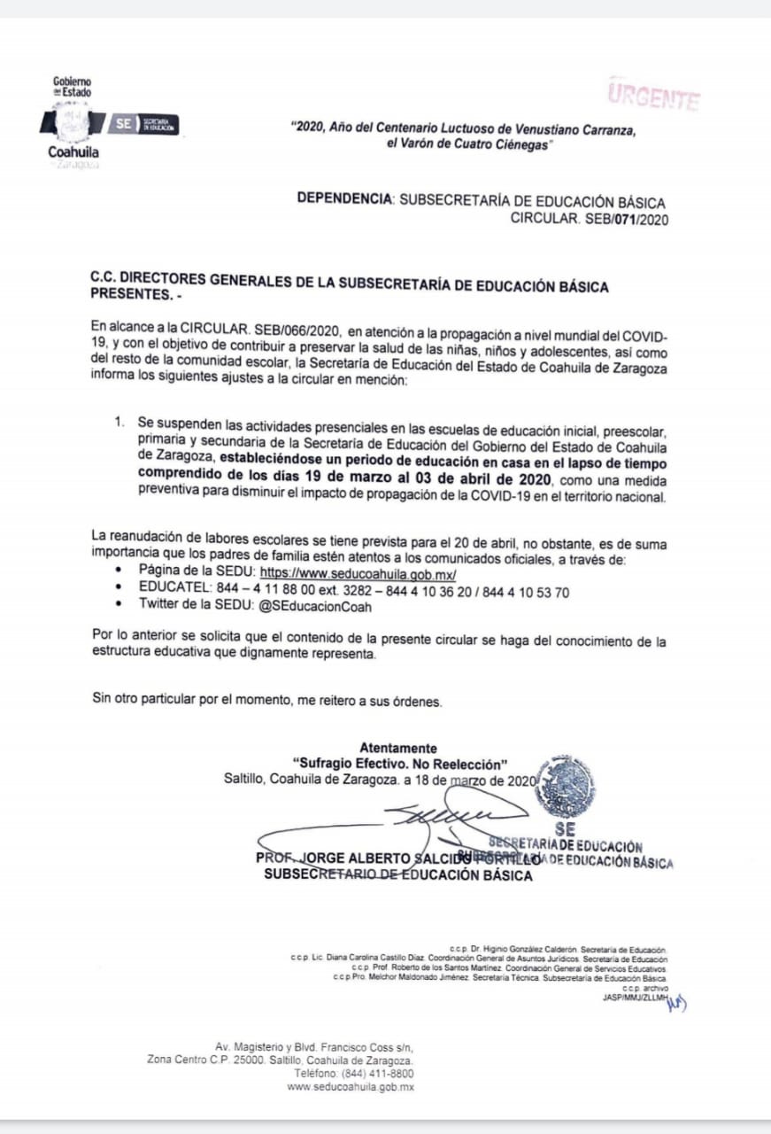 Posteriormente, la Secretaría de Educación en Coahuila informó que la entidad acataría lo dispuesto y además se realizarían acciones coordinadas entre maestros y padres de familia para mantener a los niños y jóvenes ocupados en tareas escolares en tanto pasara el período determinado por su similar federal.