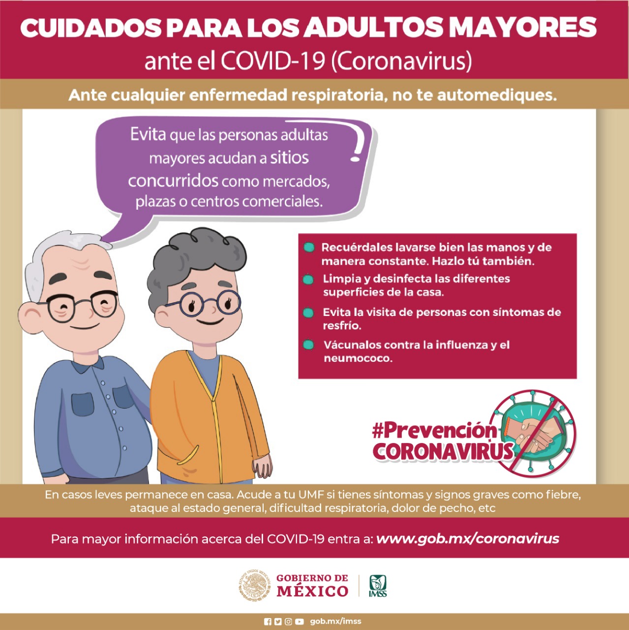 Por ello, enfatizó, “en este momento lo más importante es proteger a los adultos mayores, que son la población más susceptible a complicaciones por esta enfermedad y presentar los casos más graves; lo que tenemos que hacer como población es seguir medidas de higiene y aislamiento social: evitar los saludos de mano, beso y abrazo; lavado de manos lo más frecuente posible con agua y jabón o alcohol gel desinfectante, y no visitarlos si creemos tener síntomas respiratorios o pudimos haber estado en contacto con una persona enferma por COVID-19”.
