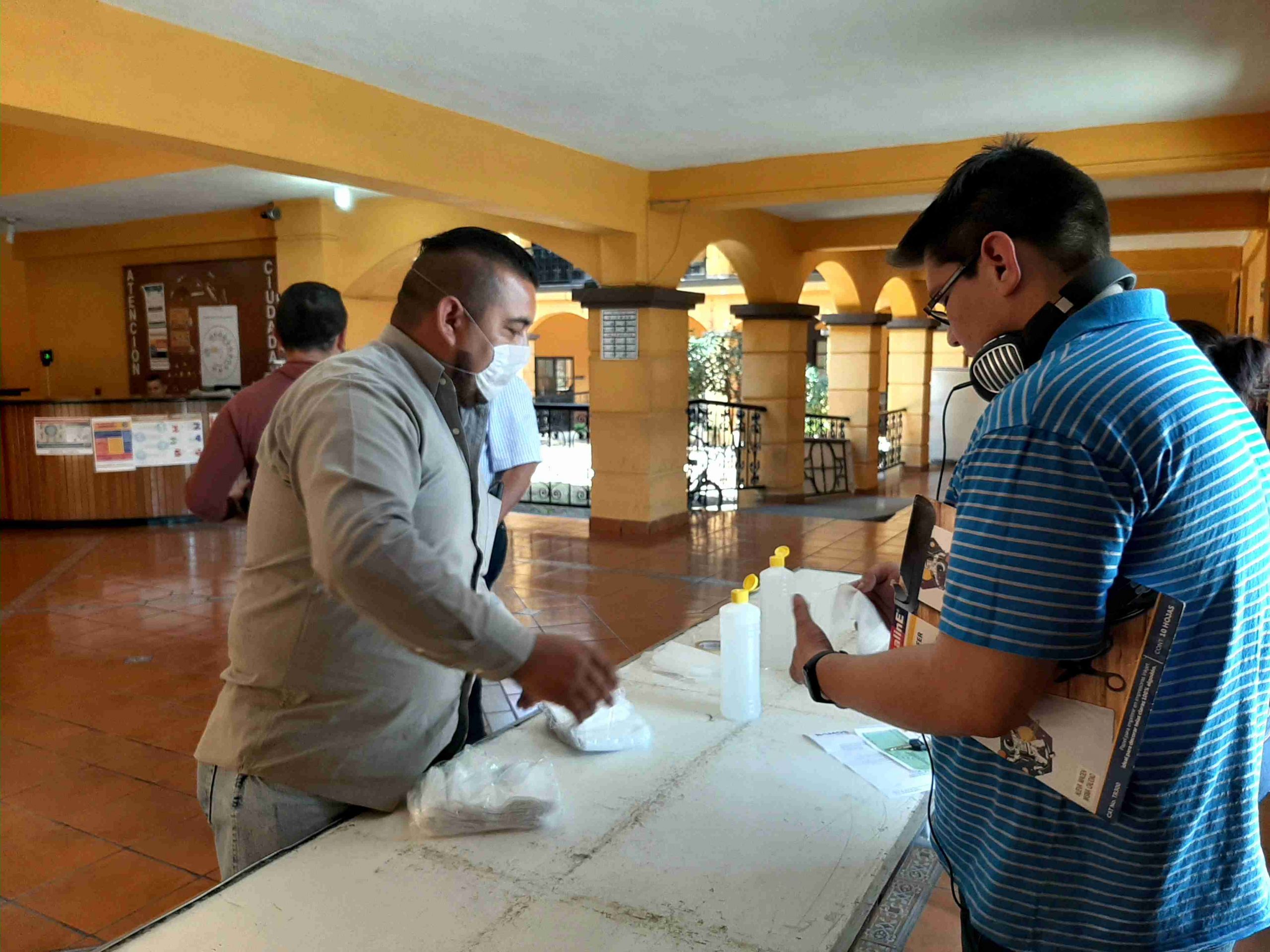 Como parte de las medidas sanitarias, se determinó que a todo el que desee ingresar al recinto tendrá que aplicársele gel antibacterial que las autoridades municipales han puesto al servicio tanto de la población como de los mismos trabajadores en la presidencia, así como también la colocación de cubre bocas en todo momento al ingresar.