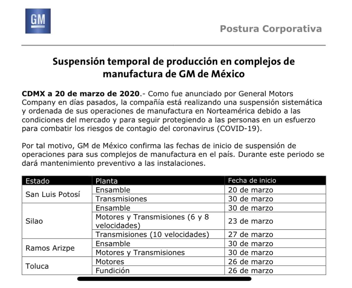 “Como fue anunciado por General Motors Company en días pasados, la compañía está realizando una suspensión sistemática y ordenada de sus operaciones de manufactura en Norteamérica, debido a las condiciones del mercado y para seguir protegiendo a las personas en un esfuerzo para combatir los riesgos de contagio del coronavirus”, señala el comunicado dado a conocer este viernes.