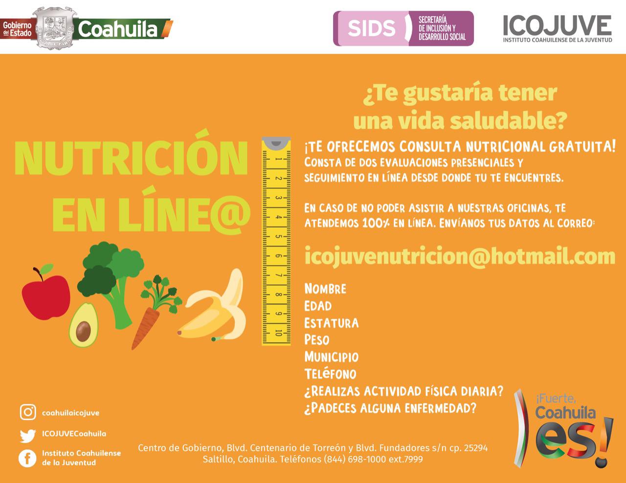 Graciela del Bosque Ruiz, nutrióloga del Instituto, indicó que se podrá atender en línea a las y los jóvenes que estén interesados en llevar a cabo un menú nutricional de manera gratuita, así como llevar un seguimiento totalmente en línea mandando los datos como nombre, edad, peso y estatura, entre otros datos personales de salud, al correo electrónico icojuvenutricion@hotmail.com.