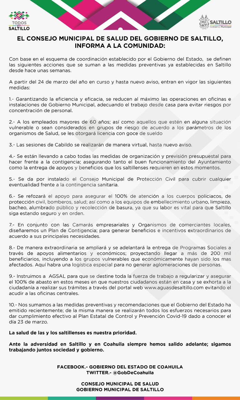 Con base en el esquema de coordinación establecido por el Gobierno del Estado, el Consejo Municipal de Salud del Gobierno de Saltillo definió las siguientes acciones que se suman a las medidas preventivas ya establecidas en Saltillo desde hace unas semanas.