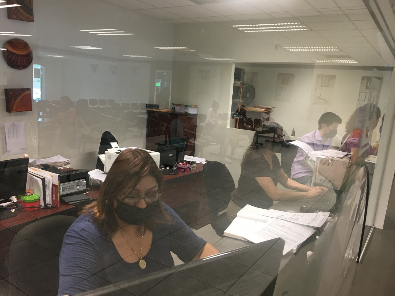 Asimismo, se está haciendo uso de guantes de látex para el manejo de la documentación, se cerraron con acrílico las ventanillas para la sana distancia y el menor contacto, el ingreso al área de Dirección, visitadores e informática es con cita previa.