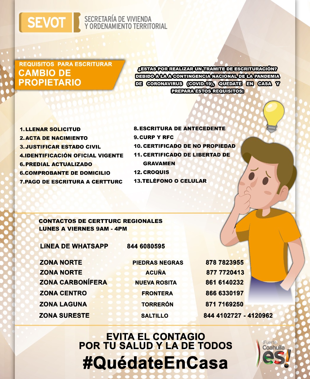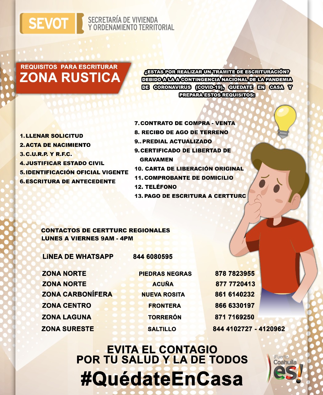 El Gobierno del Estado, a través de la Secretaría de Vivienda y Ordenamiento Territorial (SEVOT), da a conocer los requisitos para tramitar las escrituras ante la Comisión Estatal para la Regularización de la Tenencia de la Tierra Urbana y Rústica de Coahuila (CERTTURC).