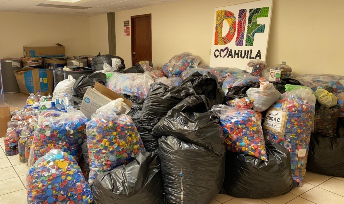 Monclova.- Gracias a la participación de las familias y diversos sectores de la población de las regiones Centro-Desierto y Carbonífera, el DIF Coahuila en estas coordinaciones logró recabar mil 970 kilos de tapas de plástico que se entregaron a la Asociación Sonrisa A.C.
