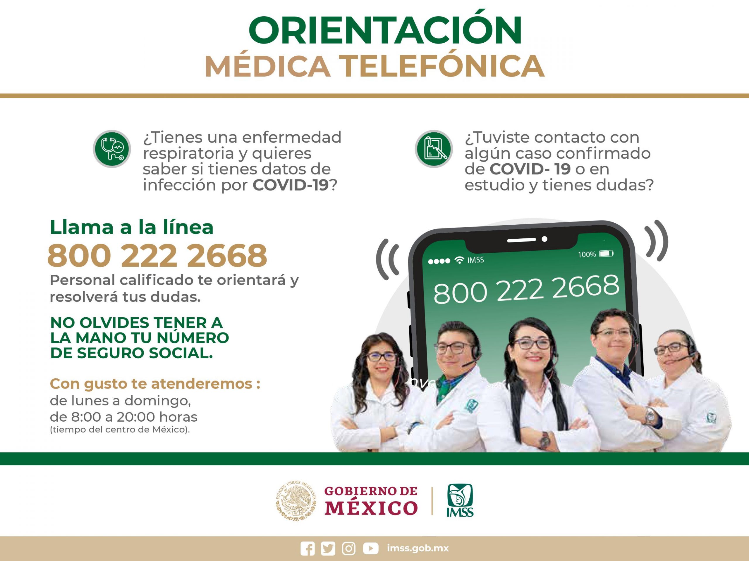 Ciudad de México.- El Instituto Mexicano del Seguro Social (IMSS) puso en marcha la estrategia “Orientación Médica Telefónica y COVID-19” a través de la línea gratuita 800-2222-668, a fin de reforzar las medidas preventivas de infecciones respiratorias.