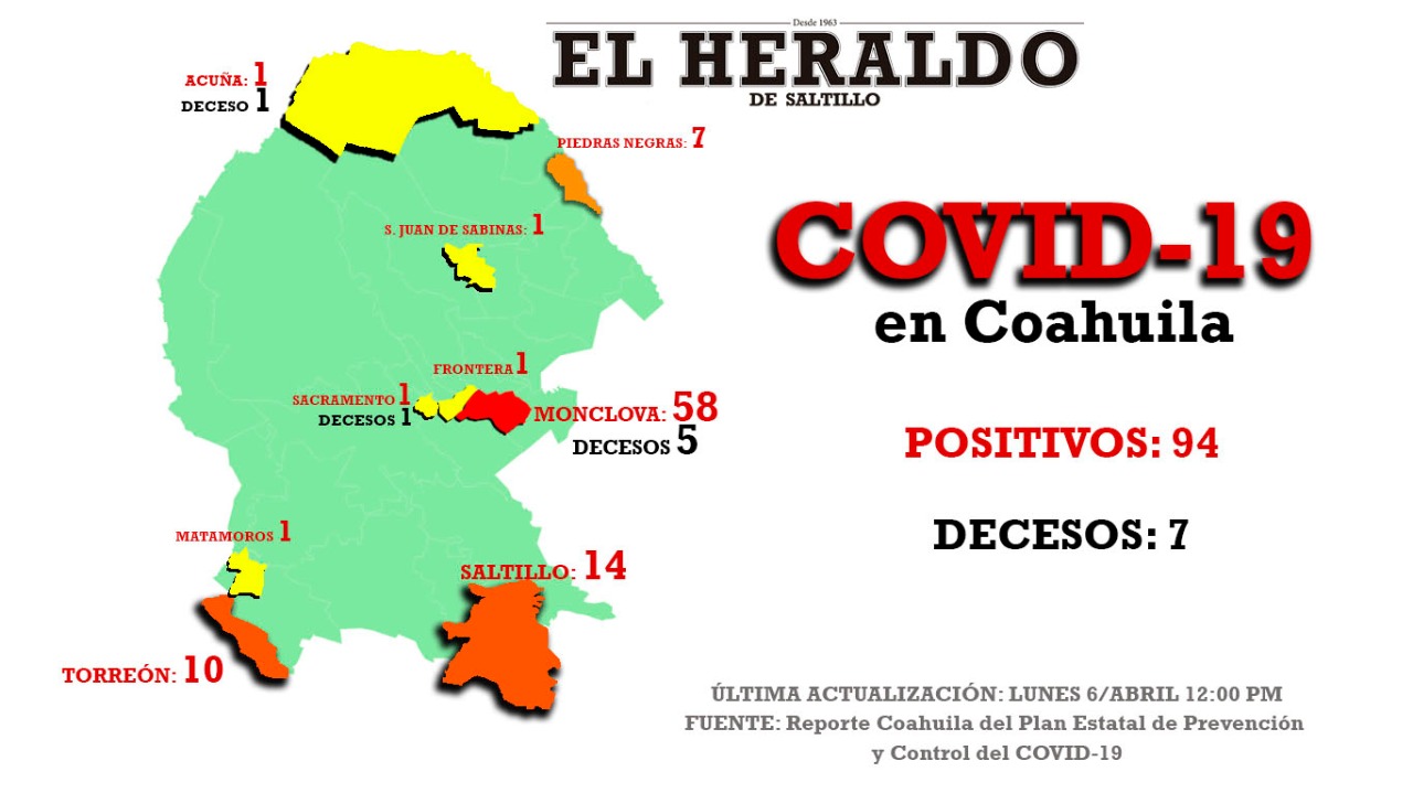 En total se contabilizan ya 94 casos en Coahuila, distribuidos de la siguiente manera: