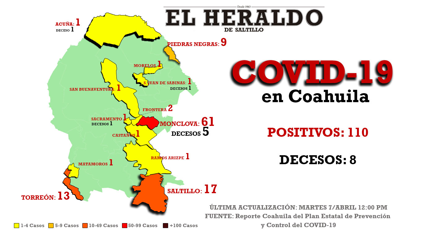 Al corte, se contabilizan en total 110 casos en Coahuila -incluidos 8 decesos- distribuidos de la siguiente manera: