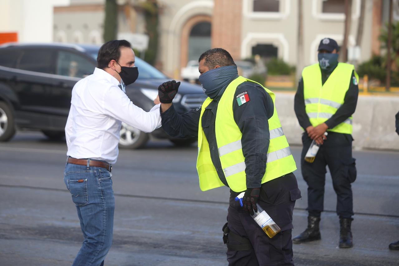 Al dar continuidad a los acuerdos sanitarios llevados a cabo en coordinación con el Gobierno del Estado, el alcalde Manolo Jiménez Salinas supervisó los filtros instalados por la Policía Municipal en las entradas a Saltillo.