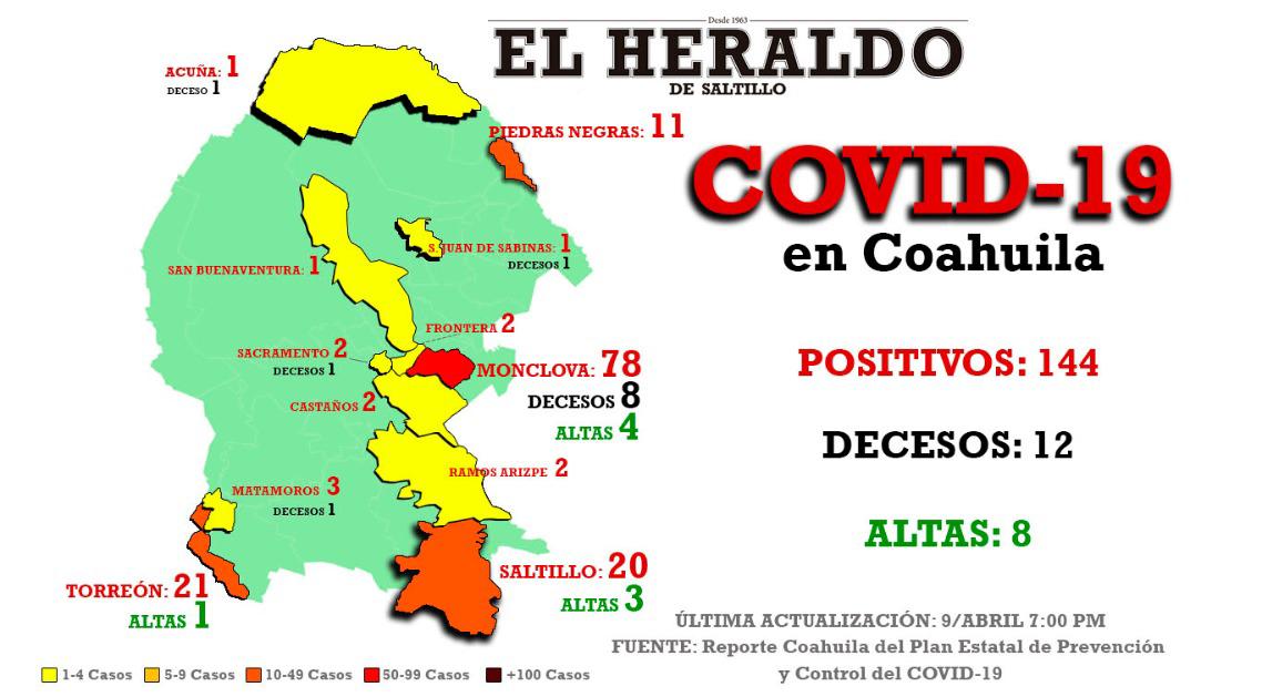En total al corte suman ya 144 casos en Coahuila –incluidos 12 fallecimientos- distribuidos de la siguiente manera: