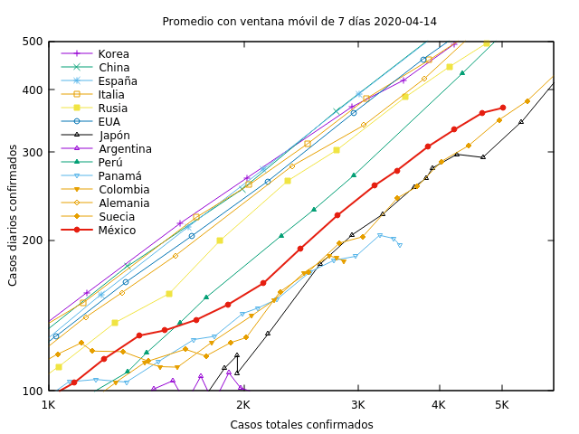 “Por otra parte, hay casos curiosos como el de Japón que no caen en esa recta sino que andan deambulando y el caso de México y otros paises latinoamericanos son un poco raros también porque nunca entran realmente a esa recta sino que se encuentran un poco inclinados en comparación a los otros países. En los últimos días México ha empezado a salirse de este comportamiento predictivo de la línea recta y tiene una ligera curvatura hacia abajo o convexa. Eso es alentador”, expuso.