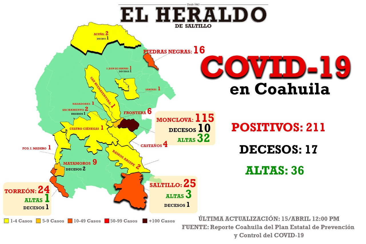 Al corte, se contabilizan en total 211 casos en Coahuila – incluidos 17 decesos – distribuidos de la siguiente manera:
